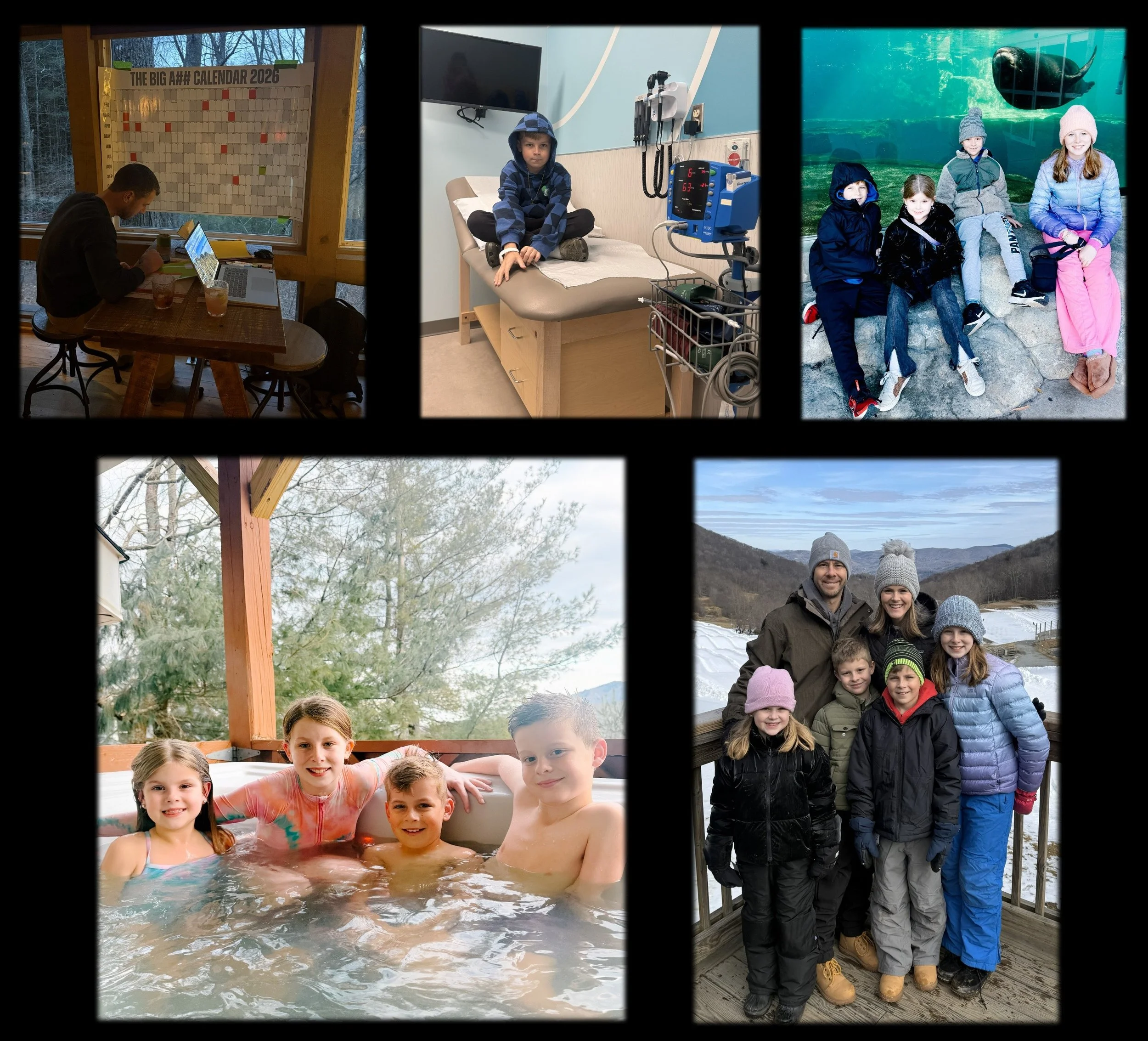 Clockwise from top left: Lauren and I were fortunate enough to get away again this year for two nights for our annual planning trip. We went back to the Treehouse near West Jefferson where we feel so quiet and isolated in the best way. It’s so good to get back in full alignment with each other as we turn the page to a new year. And yes, that is a Big A$$ Calendar taped to the window. Lauren made fun of me but it was actually super helpful. And now she can’t wait for the house to be ready so we can hang it up in just the right place. 🤣 That’s J at his annual visit to see Dr. B…coincidentally in his Disney sweatshirt. L took them to the Columbia Zoo on MLK Jr. Day…that’s become kind of a special place for them as she used to take them all there around the twins’ birthday every year. Lauren got a mountain house for the weekend right near Hawk’s Nest, so we snuck away for a quick trip. That’s us at the tubing place - so fun. The view from the hot tub was alright too!