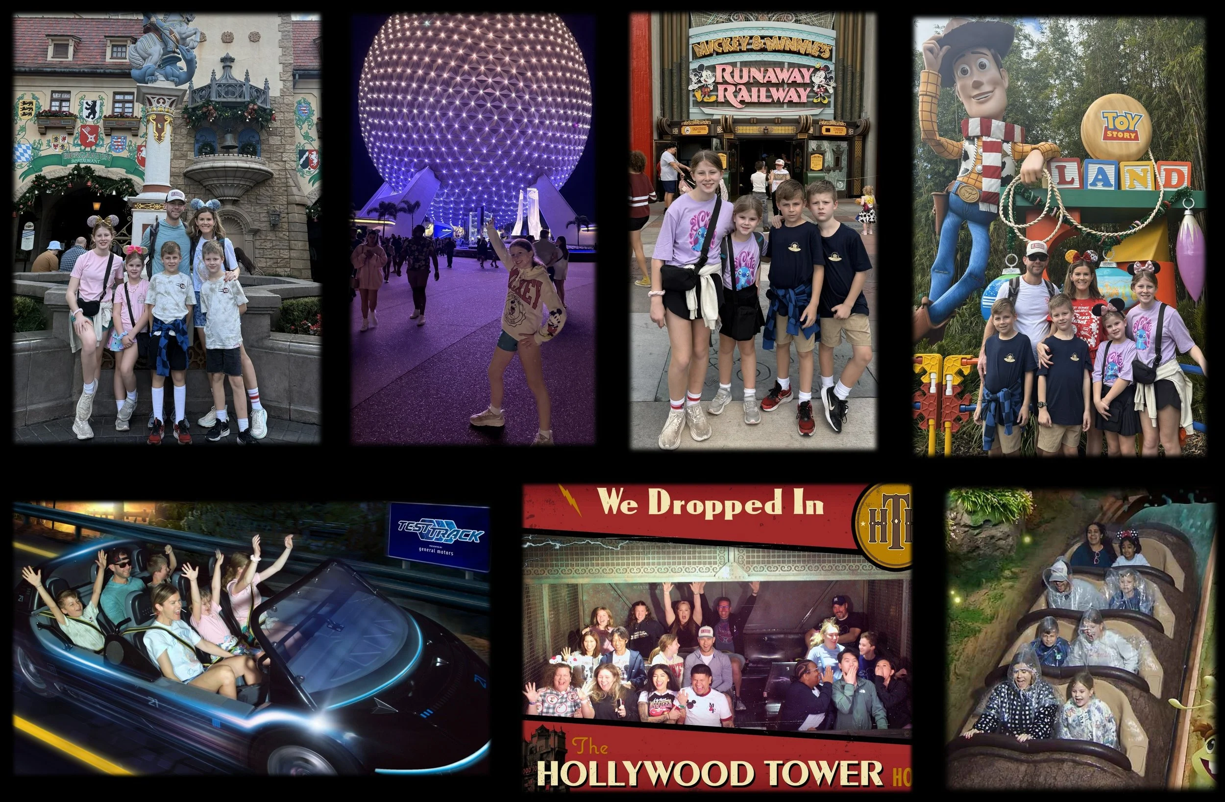 Left to right, top to bottom: Day 1 at Epcot where we had a real deal German lunch served by real deal Germans. Epcot at night is so fun - the kids love Spaceship Earth at night! Day 2 was Hollywood Studios, which we had not done since our very first trip to Disney back in 2019 - that's Charlotte’s favorite ride, Mickey’s Runaway Railway. The Palmer 6 at the entrance to Toy Story Land at Hollywood. We had lightning lane passes for Slinky Dog – one of the frontrunners for best ride – and it was a good thing…the standby line was over 2 hours at rope drop! Next, blasting out onto the track on Test Track, which had gotten a theming refresh since our last visit, but is still just as fast and just as fun. I could only get C to ride Tower of Terror with me this time…payback for taking the not-quite-3-year-old twins on it last trip! That’s us in the middle mid-drop…I’m always impressed at the people who can stage the photo while free falling. Last, all of us on Tiana’s Bayou Adventure at Magic Kingdom, which is the re-themed version of Splash Mountain. Same ride, new look. Look closely at the boys’ faces 🤣 🤣