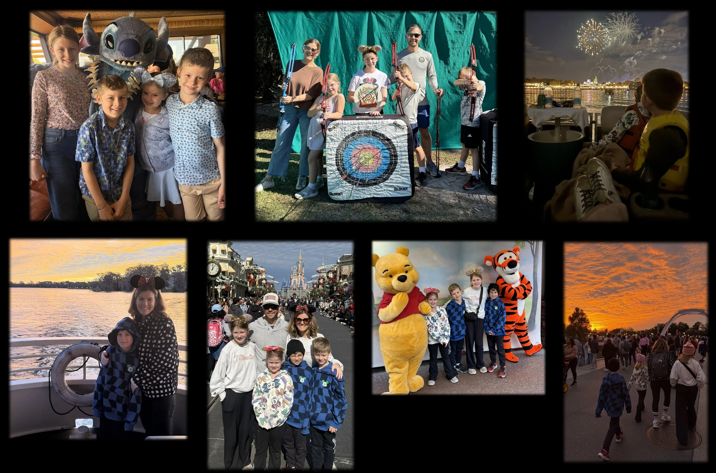 Left to right, top to bottom: We always do one “resort day” to rest from the marathon days at the parks and to enjoy the actual place you’re paying a ridiculous amount to stay. This year, on that day, we did a character breakfast for Char so she could meet her favorite - Stitch! As L reflected, this was probably our last character obsession. The big kids have already outgrown that phase. Next, family archery! We stayed at Fort Wilderness this time and that was a great family activity. We had a blast and no animals, or humans, or bullseyes, were harmed. We also did a fireworks cruise the night of our resort day, which was a fun way to see the show and get a private tour of the lake. To get to MK from Fort Wilderness, you ride a boat…which sounds fun, except when it’s in the low 40s before 7a! That’s Jennings and Lauren trying to look not frozen on the back of the boat. Next, all of us on Main St. with the castle in the background. Charlotte also really wanted to meet Pooh when we saw him out by his ride, so we waited about 45 minutes and did. She had done the Winnie the Pooh play last spring, so it was sweet. Last, we caught a magical sunset walking through Tomorrowland…everything is magical when you’re in the Disney bubble. Or so I’m told.
