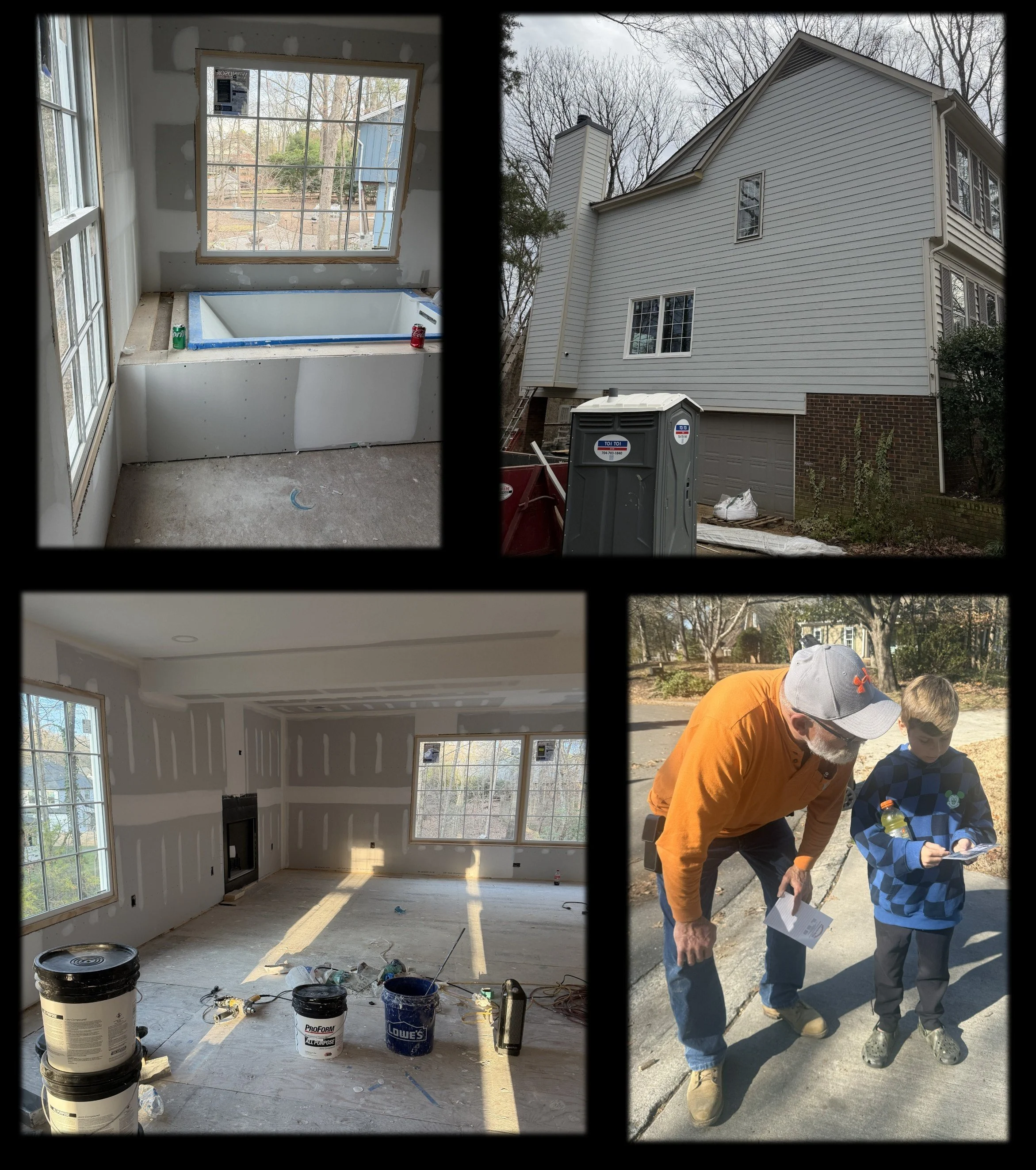 I mentioned the house and I realized it’s been a while since I’ve updated on that front. Things slowed down at the end of the year from Thanksgiving through the New Year, which was hard. But, we got in-wall and rough-in inspections the first week of January, so our builder has been off to the races. We have drywall, prime paint inside, siding is on, the new HVAC units are now running! Here’s a few showing the progress…and one of our builder, Tom, and Jennings, who he has a soft spot for. They are most likely reviewing some change orders to install a gaming nook in the boys room complete with a mini fridge and fully stocked secret snack hideout.