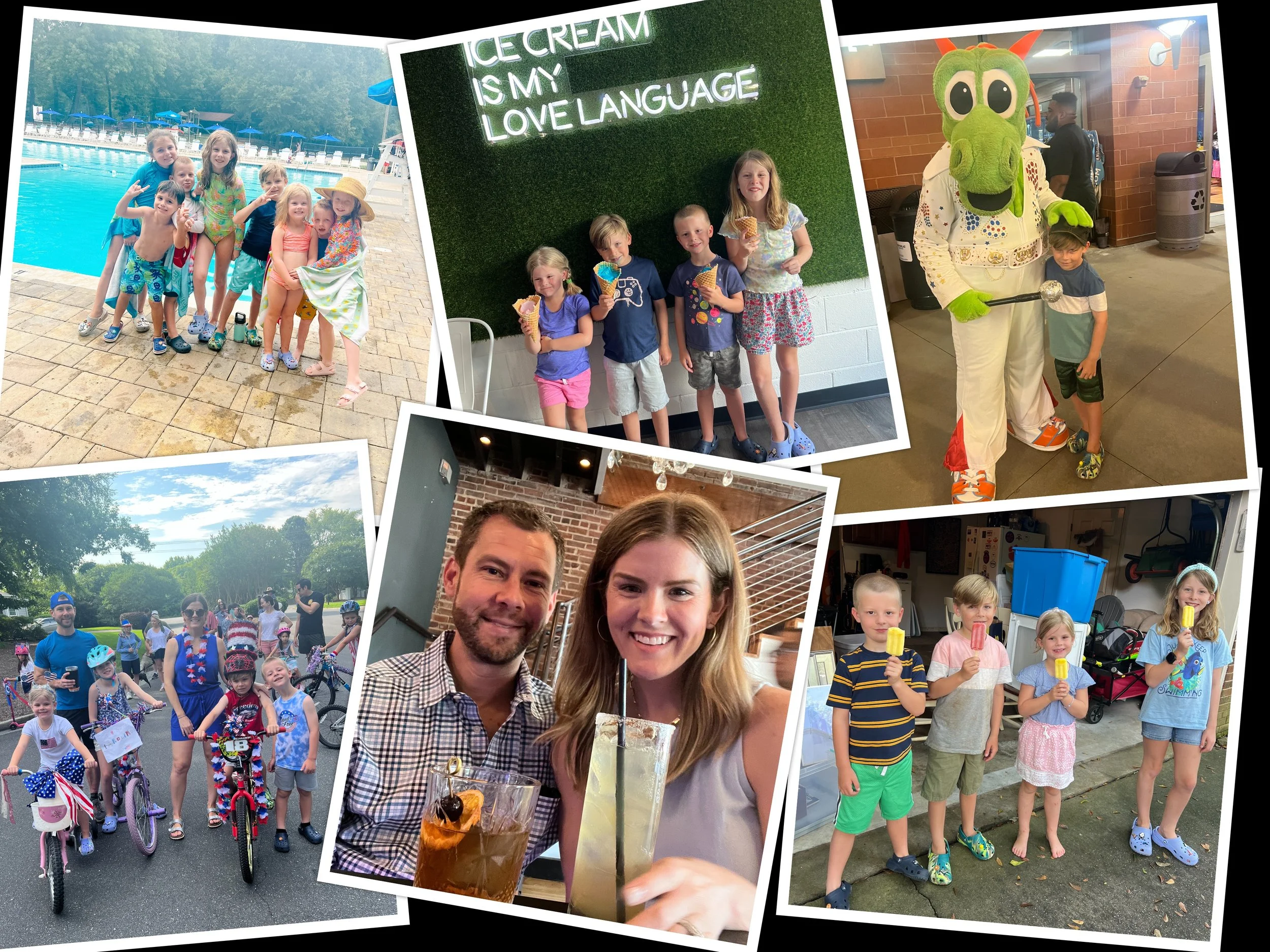 Left to right, top to bottom: the pool with friends is a summer staple (as are peace signs in most of our photos); cooling off with ice cream; took J to a Knights game and they happened to be playing the Memphis Redbirds!…Homer commemorated it by dressing as the kitar man; Sturnbridge 4th of July parade; a date night!; and we had a garage sale and bribed the kids with popsicles not to scare away our customers. Quick aside on the ice cream picture - it was my idea to go in the first place, which does not happen everyday (spontaneity is not my strong suit). Then, it just so happened to be National Ice Cream Day which meant the kids got those giant waffle cones for free. And then, while we were checking out, a train went by outside which meant we got 50% our total!